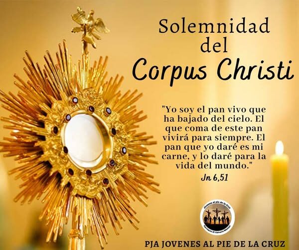 Conocida como Solemnidad del Santísimo Cuerpo y Sangre de Cristo, esta fiesta honra a Jesucristo, verdadera y realmente presente substancialmente bajo las apariencias del pan y del vino. Esa Presencia ocurre gracias a un cambio que la Iglesia llama transubstanciación (cambio de sustancia), en el momento en que el sacerdote, durante la Consagración en la Misa, dice las palabras que el mismo Cristo pronunció sobre el pan y el vino: “Este es Mi Cuerpo”, “Esta es Mi Sangre”, “Hagan esto en memoria Mía”. En 2025, la Solemnidad de Corpus Christi es el 19 de junio, pero se transfiere al domingo 22 de junio en algunas diócesis.