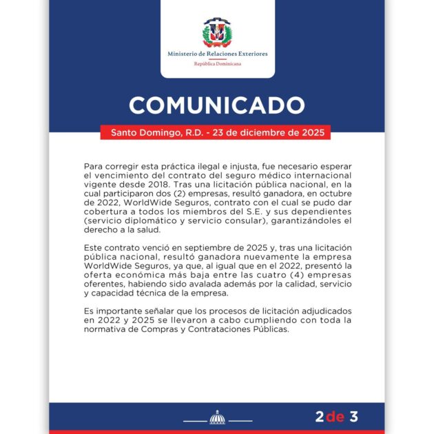 Apegado a los principios de ética y transparencia que han caracterizado a esta gestión, el Ministerio de Relaciones Exteriores tiene a bien precisar que, una de las distorsiones administrativas encontradas a lo interno de la institución en 2020, se refiere al seguro médico internacional para los miembros del Servicio Exterior (S.E.) y sus familiares directos, que se otorgaba de manera discrecional solo a los embajadores y a algunos ministros consejeros, en franca violación de la Ley núm. 630-16 Orgánica del Ministerio de Relaciones Exteriores y del Servicio Exterior, que en su artículo 87 establece: “El Ministerio de Relaciones Exteriores deberá proveer un seguro de salud internacional al personal asignado al servicio exterior…”.