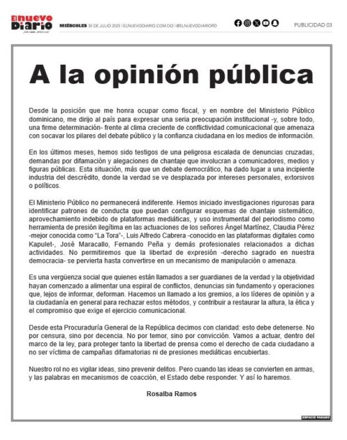 En ese sentido, advirtió que estas prácticas deben detenerse. «Desde esta Procuraduría General de la República decimos con claridad: esto debe detenerse. No por censura, sino por decencia. No por temor, sino por convicción. Vamos a actuar dentro del marco de la ley, para proteger tanto la libertad de prensa como el derecho de cada ciudadano a no ser víctima de campañas difamatorias ni de presiones mediáticas encubiertas».