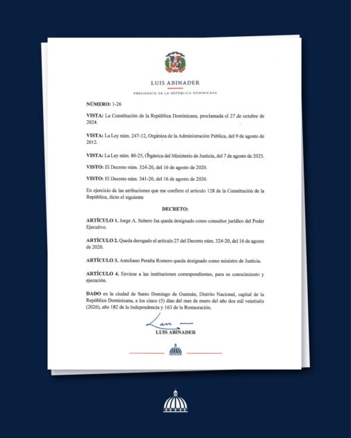 El presidente de la República, Luis Abinader, emitió el Decreto núm. 1-26 mediante el cual designó a Jorge Subero Isa como consultor jurídico del Poder Ejecutivo y nombró a Antoliano Peralta Romero como ministro de Justicia, como parte del proceso de fortalecimiento institucional y adecuación del sistema jurídico del Estado al marco legal vigente.