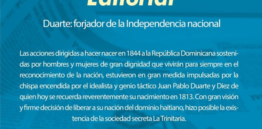 Las acciones dirigidas a hacer nacer en 1844 a la República Dominicana sostenidas por hombres y mujeres de gran dignidad que vivirán para siempre en el reconocimiento de la nación, estuvieron en gran medida impulsadas por la chispa encendida por el idealista y genio táctico Juan Pablo Duarte y Diez de quien hoy se recuerda reverentemente su nacimiento en 1813. Con gran visión y firme decisión de liberar a su nación del dominio haitiano, hizo posible la existencia de la sociedad secreta La Trinitaria para sumar voluntades a la lucha y al grupo La Filantrópica que convirtió escenarios teatrales en herramientas para, burlando la vigilancia de los opresores, difundir en el seno de la comunidad de entonces las ideas independentistas que finalmente hicieron realidad la emancipación aunque luego fue necesaria la guerra restauradora con la que el patriotismo y el uso pleno y valiente de las armas se impuso al imperio español al cual había sido anexado el naciente Estado.