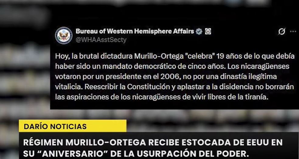 Bureau of Western Hemisphere Affairs @WHAAsstSecty · 4h Hoy, la brutal dictadura Murillo-Ortega “celebra” 19 años de lo que debía haber sido un mandato democrático de cinco años. Los nicaragüenses votaron por un presidente en el 2006, no por una dinastía ilegítima vitalicia. Reescribir la Constitución y aplastar a la disidencia no borrarán las aspiraciones de los nicaragüenses de vivir libres de la tiranía.@WHAAsstSecty – DM INTERNACIONAL VIDEO – @PresidenciaRD – @ViceRDo – @MinpreRD – @JosePaliza – @CarolinaMejiaG – @LaVozDelPRM – @LuisAbinader – @RaquelPenaVice- @PRM_Oficial – @ElizabethMateo – @AlbertoCaminero – @FelixReynaE – @DeligneAB –@dpprdo – @Pachecoalfredoo -@DavidColladoM
