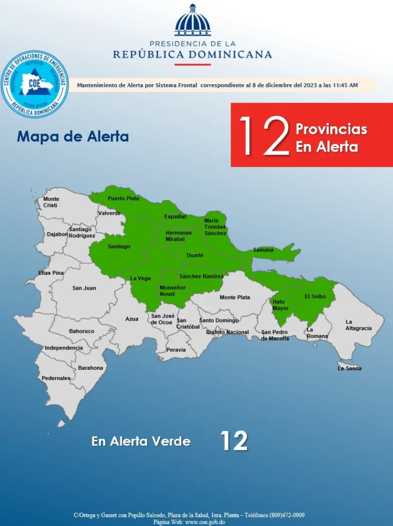 Las provincias en alerta son: María Trinidad Sánchez, Espaillat, Santiago, Samaná, Hermanas Mirabal, Hato Mayor y Duarte. El COE también incluyó en la lista a Puerto Plata, El Seibo, La Vega, Monseñor Nouel y Sánchez Ramírez.