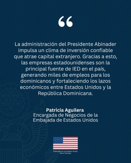 “La administración del Presidente Abinader impulsa un clima de inversión confiable que atrae capital extranjero. Gracias a esto, las empresas estadounidenses son la principal fuente de IED en el país, generando miles de empleos para los dominicanos y fortaleciendo los lazos económicos entre Estados Unidos y la República Dominicana.” – Patricia Aguilera, encargada de Negocios de la Embajada de Estados Unidos en Santo Domingo.