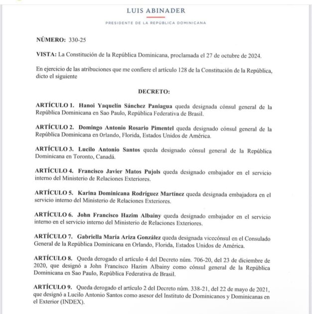 El Presidente Luis Abinader, realizó nuevas designaciones diplomáticas y consulares a través del Decreto 330-25, emitido ayer viernes, como parte de una reestructuración en el servicio exterior e interno del Ministerio de Relaciones Exteriores (MIREX). pic.twitter.com/lWNw5oR4kP