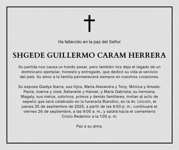 “Ha fallecido en la paz del señor SHGEDE Guillermo Caram Herrera”, se lee en una publicación compartida en la red social de Instagram entre la Alianza Libanesa en la República Dominicana y Guillermo Caram.