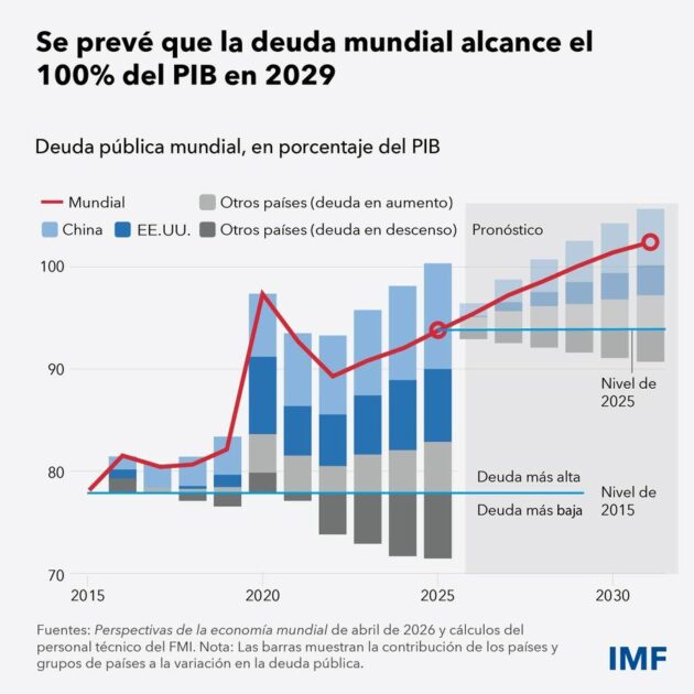 El informe del FMI señala que la deuda pública mundial alcanzará el 100% del PIB en 2029, dos años antes de lo previsto, impulsada por los elevados niveles de deuda en EEUU y China