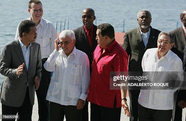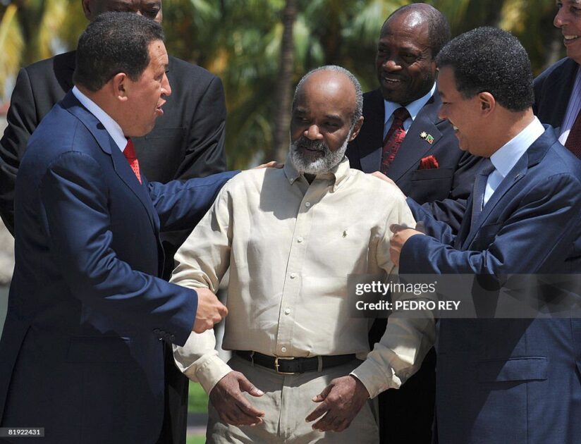 Venezuelan President Hugo Chavez (L), Haiti’s Rene Preval (C) and Dominican President Leonel Fernandez joke before the official picture of the V Petrocaribe Extraordinary Summit in Maracaibo, Venezuela on July 13, 2008. AFP PHOTO/ Pedro REY (Photo credit should read PEDRO REY/AFP via Getty Images)