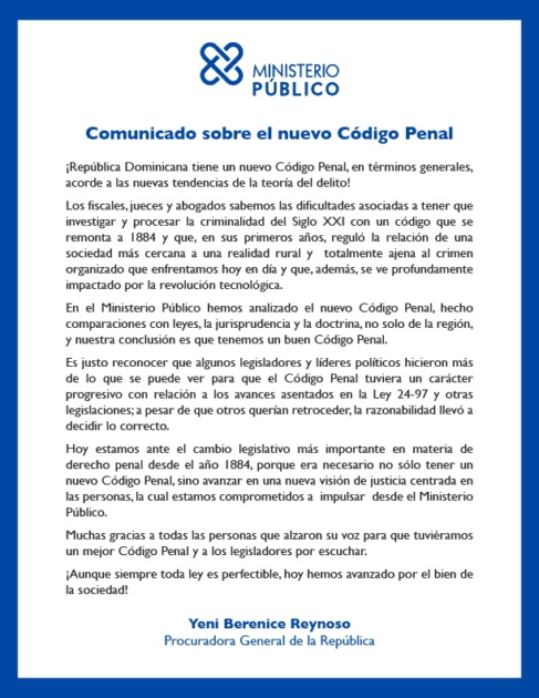 “¡República Dominicana tiene un nuevo Código Penal, en términos generales, acorde a las nuevas tendencias de la teoría del delito!”, destacó Reynoso en un comunicado.