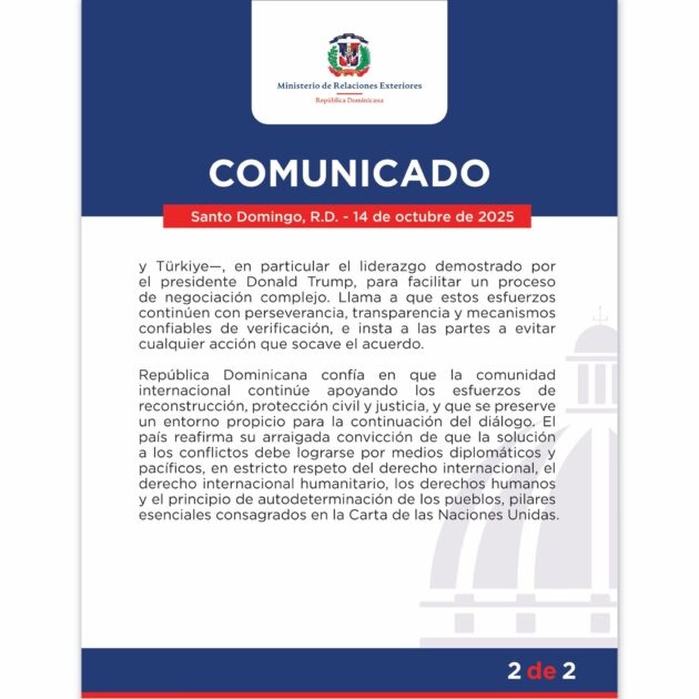 Santo Domingo de Guzmán, República Dominicana. – El Gobierno dominicano acoge con profunda satisfacción el acuerdo de alto al fuego alcanzado entre Israel y Hamás, con la mediación de los gobiernos de Estados Unidos, Egipto, Catar y Türkiye, y respalda el compromiso manifestado por las partes involucradas en favor de la paz, la seguridad y el alivio humanitario.