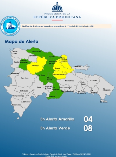 El COE aumenta 07 provincias en alerta amarilla y mantiene 12 y el Distrito Nacional en verde, debido a que el INDOMET e INDRHI, establecen que, una vaguada pre-frontal al...