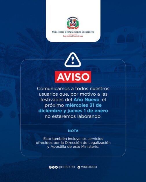 @MirexRD Comunicamos a todos nuestros usuarios que, por motivo de las festividades de Año Nuevo, los días miércoles 31 de diciembre y jueves 1 de enero no estaremos laborando