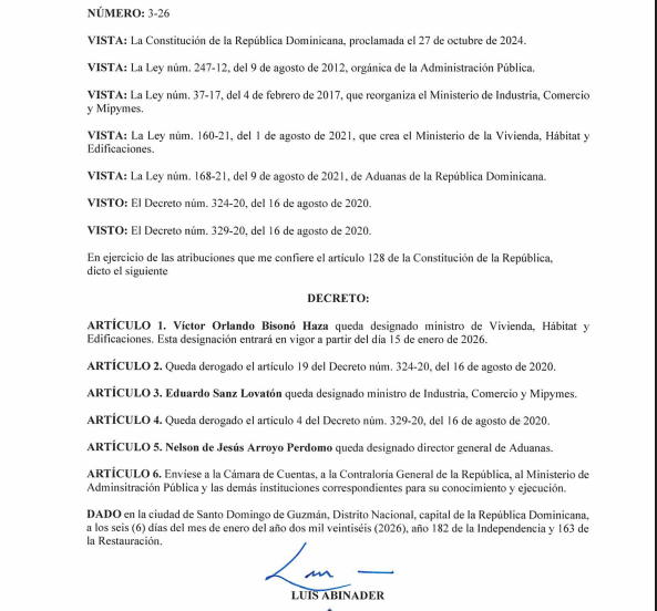 Luis Abinader, presidente Constitucional de la República Dominicana 2020-2028 Decreto 03-26 Presidente Abinader realiza nuevos nombramientos en Industria y Comercio, Aduanas y Viviendas mediante el Decreto 3-26 @PresidenciaRD –@ViceRDo –…
