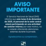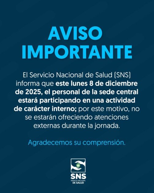 @SNSRDO informa que este lunes 8 de diciembre de 2025, el personal de la sede central estará participando en una actividad de carácter interno; por este motivo, no se estarán ofreciendo atenciones externas durante la jornada