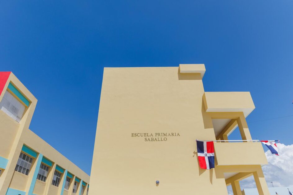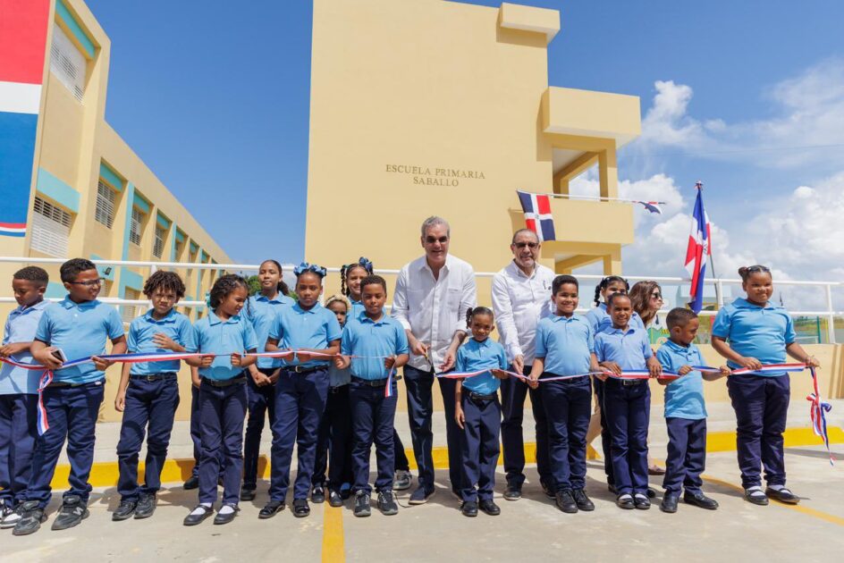 En Imbert, #PuertoPlata, celebran la entrega, por parte del Pdte. @LuisAbinader y @LMDeCamps, de la 🏫Escuela Primaria Saballo, la cual beneficiará a 735 estudiantes dotándolos con espacios dignos: 21 aulas, biblioteca, cancha, salón multiusos y más. pic.twitter.com/Qu1eYxHNCr