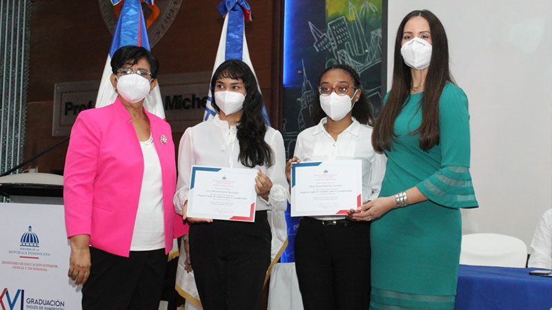 Durante la ceremonia, las egresadas Laura María Céspedes y Alexa Chanel Martínez, recibieron un reconocimiento por registrar mayores índices y expresaron su agradecimiento por la facilidad brindada por el MESCYT.