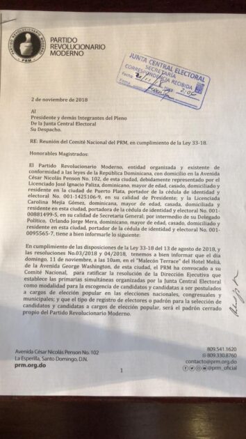 La comunicación de fecha 2 de noviembre de 2018, suscrita por Orlando Jorge Mera, Delegado Político del PRM, informa igualmente a la JCE que la convocatoria fue realizada a los fines de “ratificar la resolución de la Dirección Ejecutiva que establece las primarias simultáneas organizadas por la Junta Central Electoral como modalidad de escogencia de candidatos y candidatas a ser postulados a cargos de elección popular en las elecciones nacionales, congresuales y municipales; y el tipo de registro de electores o padrón para la selección de candidatos y candidatas a cargos de elección popular, será el padrón cerrado propio del Partido Revolucionario Moderno”.