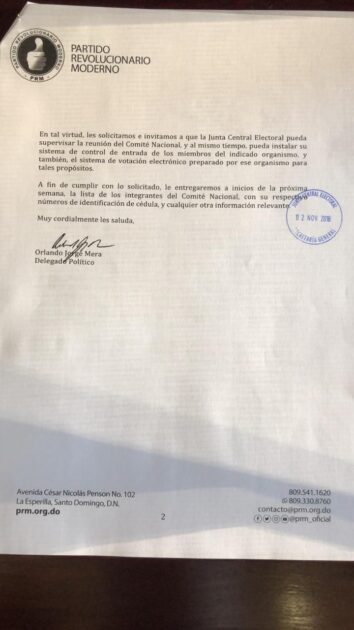 La Junta Central Electoral (JCE) recibió una solicitud de asistencia técnica por parte del Partido Revolucionario Moderno (PRM) para su reunión del Comité Nacional, la cual tendrá lugar el día 11 de noviembre del año en curso.