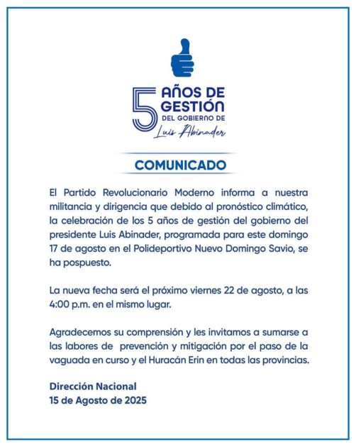 “Informamos a nuestra dirigencia y militancia que, por el pronóstico climático, la actividad prevista para este domingo 17 de agosto se reprograma para el viernes 22 de agosto, 4:00 p.m., en el Polideportivo Nuevo Domingo Savio”