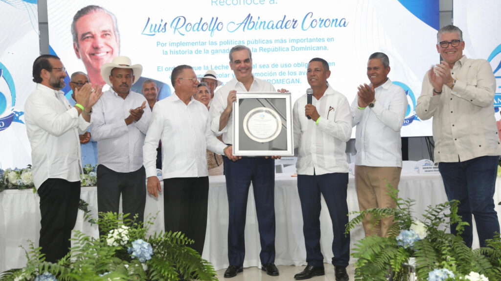 Santo Domingo.- Los productores de leche del país, agrupados en la Asociación Dominicana de Productores de Leche (Aproleche), entregaron hoy un reconocimiento al presidente Luis Abinader, a quien consideraron como quien ha implementado las políticas públicas más importantes en la historia de la ganadería en la República Dominicana.