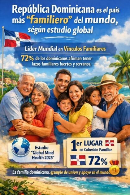 Según el informe “Global Mind Health 2025” de Sapiens Labs, República Dominicana se posicionó como el país con los lazos familiares más sólidos y “familieros” del mundo, con un 72% de respuestas favorables sobre apoyo y cercanía familiar. El estudio destaca que en el país la familia es una forma de vida, superando el promedio global del 61% en cohesión social.