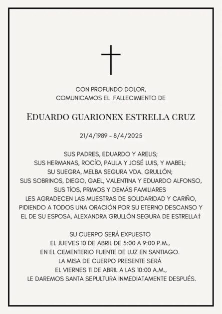 En este momento de inmenso dolor, la familia agradece las innumerables muestras de cariño y solidaridad, y pide a todos elevar una oración por el eterno descanso de Eduardo y Alexandra, cuyas vidas fueron truncadas en medio de un lamentable suceso que aún deja más preguntas que respuestas.
