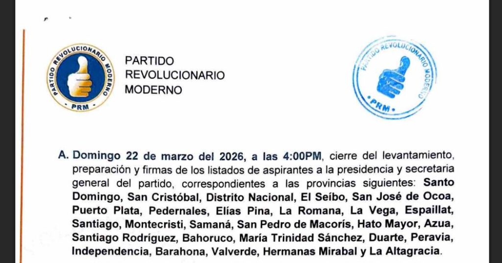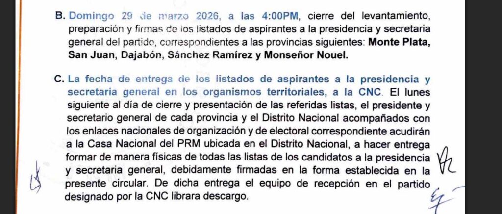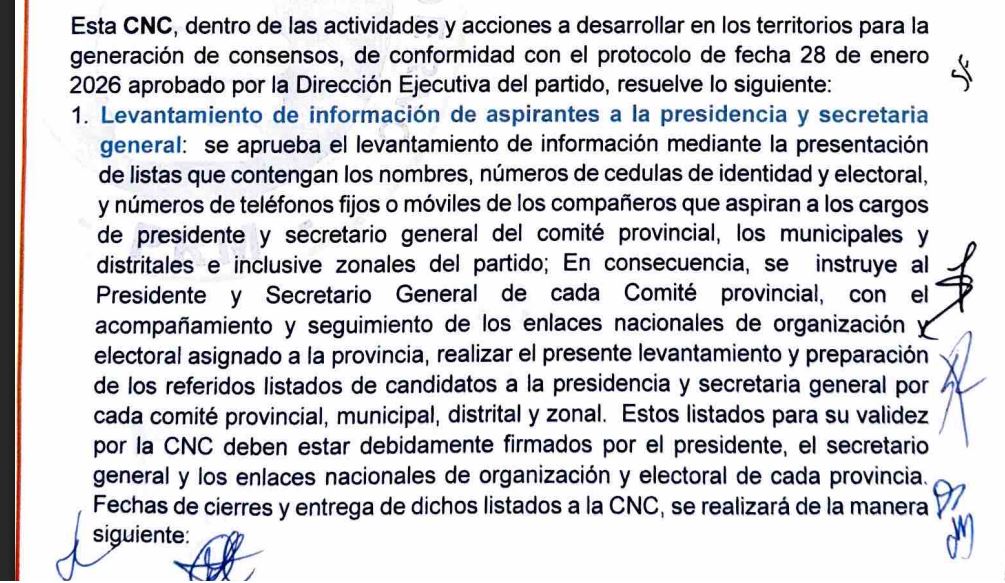 De acuerdo con una circular emitida por esa comisión, el proceso incluye el levantamiento formal de información de los aspirantes a las presidencias y secretarías generales en los comités provinciales, municipales, distritales y zonales. Para ello, se instruyó a las estructuras del partido a elaborar listados con los nombres, números de cédula y datos de contacto de cada aspirante.