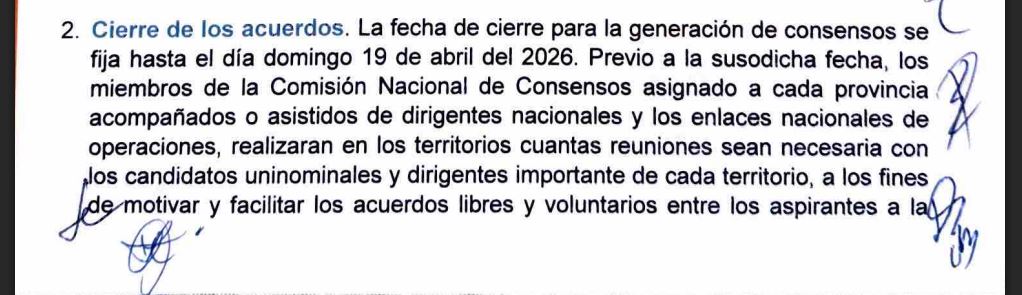 Para ello, la Comisión de Consensos fijó como fecha límite el domingo 19 de abril de 2026, un plazo durante el cual sus miembros, junto a dirigentes nacionales y enlaces territoriales, deberán realizar reuniones en las distintas demarcaciones.