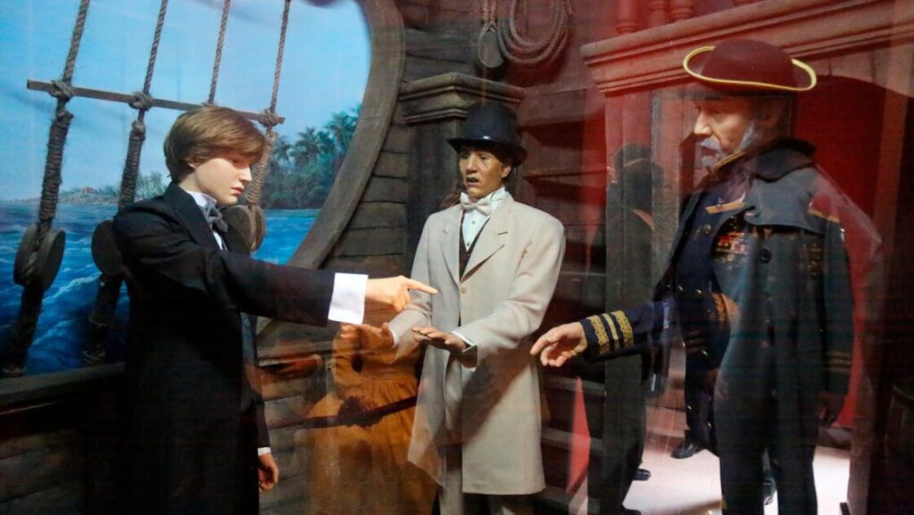 Escena expuesta en el Museo Juan Pablo Duarte, en la que se percibe al futuro patriota ante un oficial español, quien le preguntó si a él no le daba pena decir que era haitiano. Foto: Archivo de Diario Libre