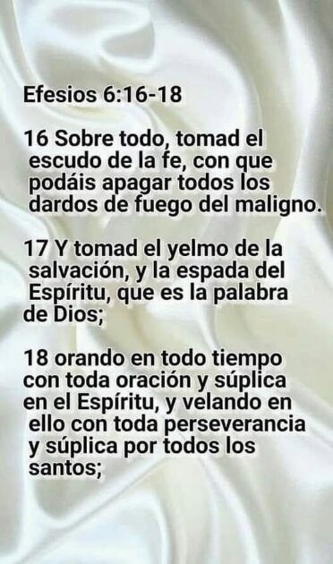 10 Por lo demás, hermanos míos, fortaleceos en el Señor, y en el poder de su fuerza. 11 Vestíos de toda la armadura de Dios, para que podáis estar firmes contra las asechanzas del diablo. 12 Porque no tenemos lucha contra sangre y carne, sino contra principados, contra potestades, contra los gobernadores de las tinieblas de este siglo, contra huestes espirituales de maldad en las regiones celestes. 13 Por tanto, tomad toda la armadura de Dios, para que podáis resistir en el día malo, y habiendo acabado todo, estar firmes. 14 Estad, pues, firmes, ceñidos vuestros lomos con la verdad, y vestidos con la coraza de justicia, 15 y calzados los pies con el apresto del evangelio de la paz. 16 Sobre todo, tomad el escudo de la fe, con que podáis apagar todos los dardos de fuego del maligno. 17 Y tomad el yelmo de la salvación, y la espada del Espíritu, que es la palabra de Dios; 18 orando en todo tiempo con toda oración y súplica en el Espíritu, y velando en ello con toda perseverancia y súplica por todos los santos;